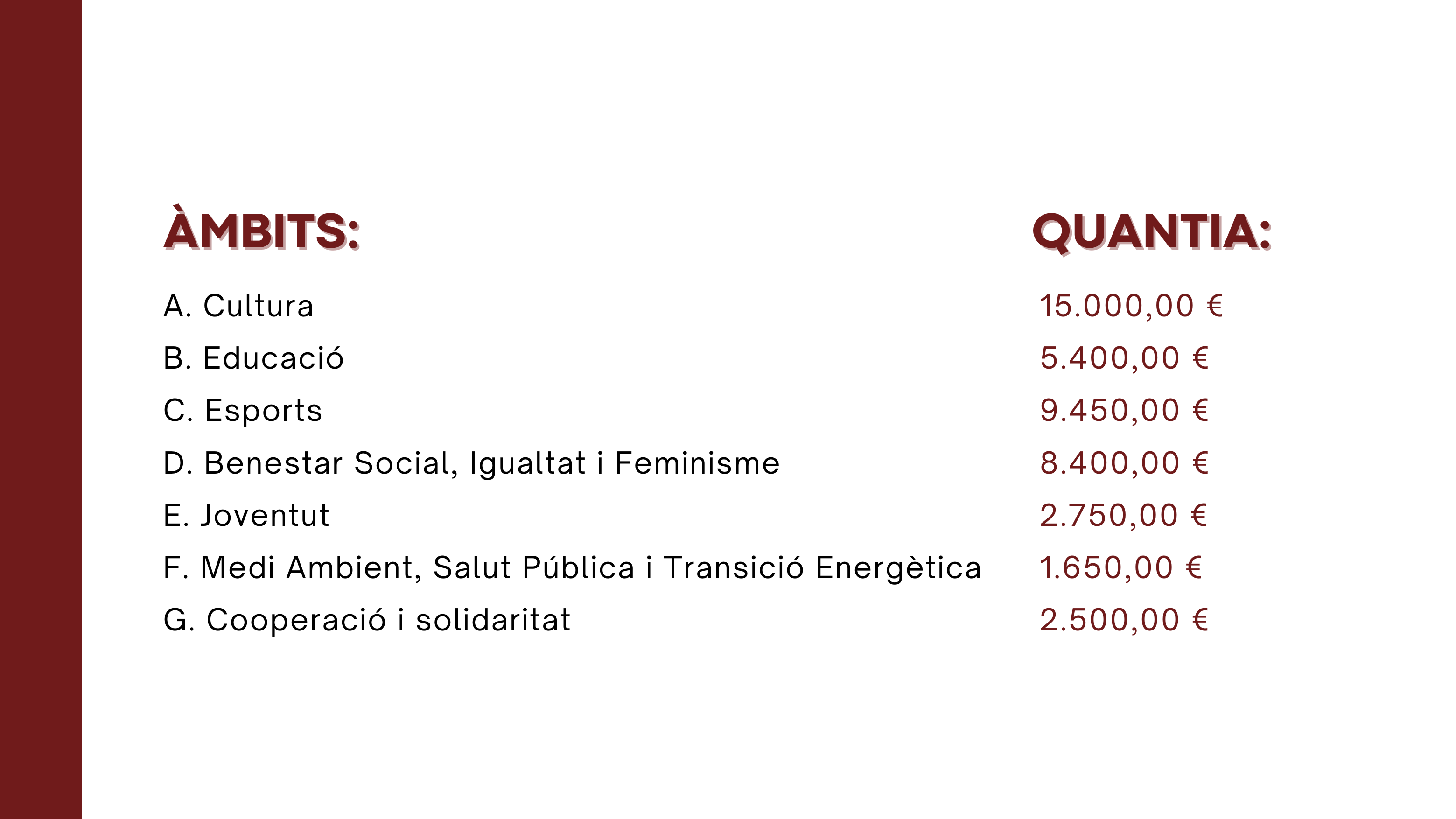L’objecte de les subvencions de la present convocatòria és finançar projectes/activitats en els àmbits temàtics anteriors, és per això, que cada categoria té una quantia màxima la qual es pot obtenir. Aquí pots consultar els imports: